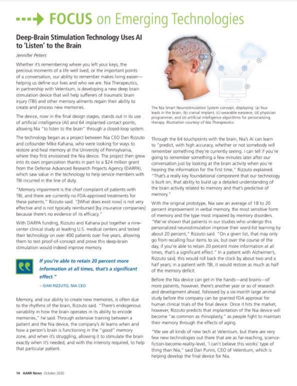 “Focus on Emerging Technologies: Deep-Brain Stimulation Technology Uses AI to ‘Listen’ to the Brain,” AAMI News, October 2020