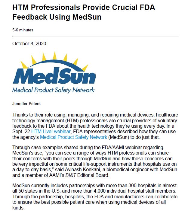 “HTM Professionals Provide Crucial FDA Feedback Using MedSun,” AAMI, October 8, 2020