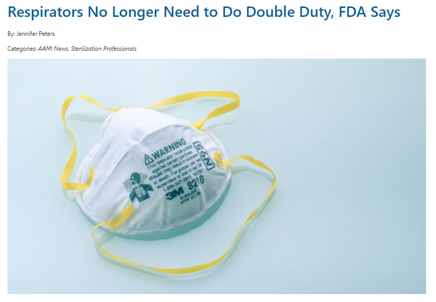 “Respirators No Longer Need to Do Double Duty, FDA Says,” AAMI, April 29, 2021
